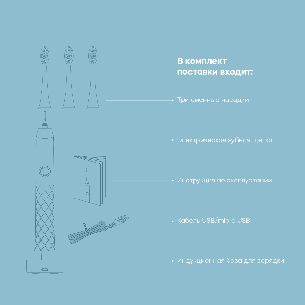 - З режима работы (отбеливание, регулярная чистка, массаж) для достижения наилучшего результата в зависимости от ваших индивидуальных потребностей