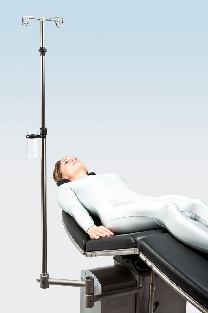 Этот штатив для инфузий с четырьмя крючками считается самой надежной моделью, он устанавливается на колонне хирургического стола и потому при регулировке высоты кушетки не смещается наверх. Вращение в сторону осуществляется при помощи шарнирного соединения.