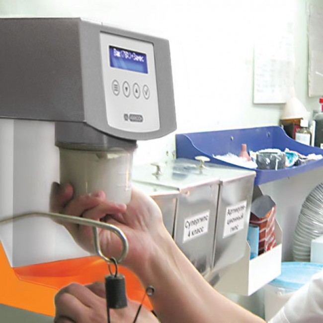 2. Колба фиксируется в вакуум-смесителе за счет разрежения: подносим колбу со смесью – нажимается контактный выключатель, создается вакуум (колбу можно отпустить), после чего начинается замес. Когда заканчивается заданное время, вакуум-смеситель автоматически отключается.