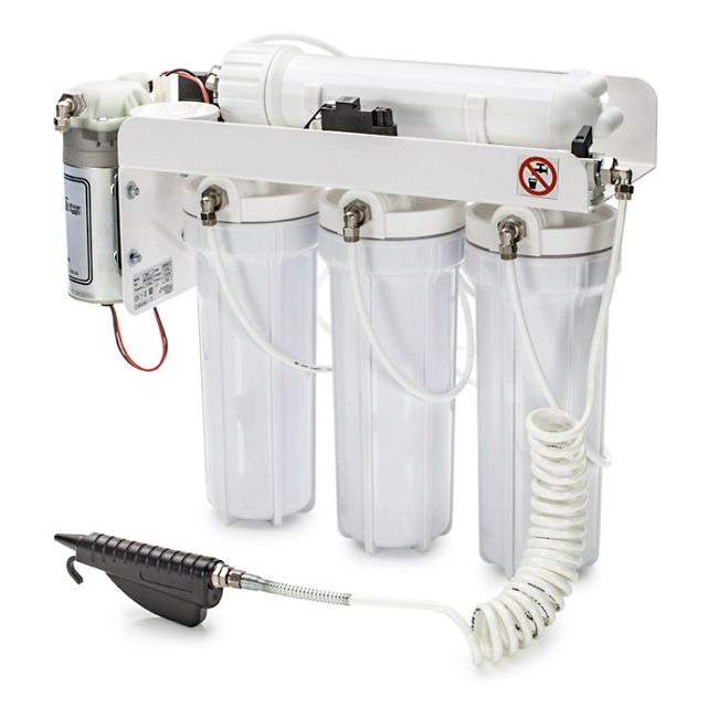 Многоступенчатая модель в автоматическом режиме подает воду сразу в несколько стерилизаторов и после отработки сливает ее напрямую. Osmo – идеальное решение при необходимости использования больших объемов воды. Эффективно очищает от примесей, исключая выпадение осадка и появления накипи на элементах стерилизационного оборудования. Средняя производительность – до 5 литров в час. В комплекте есть резервуар для хранения 9 литров очищенной воды.